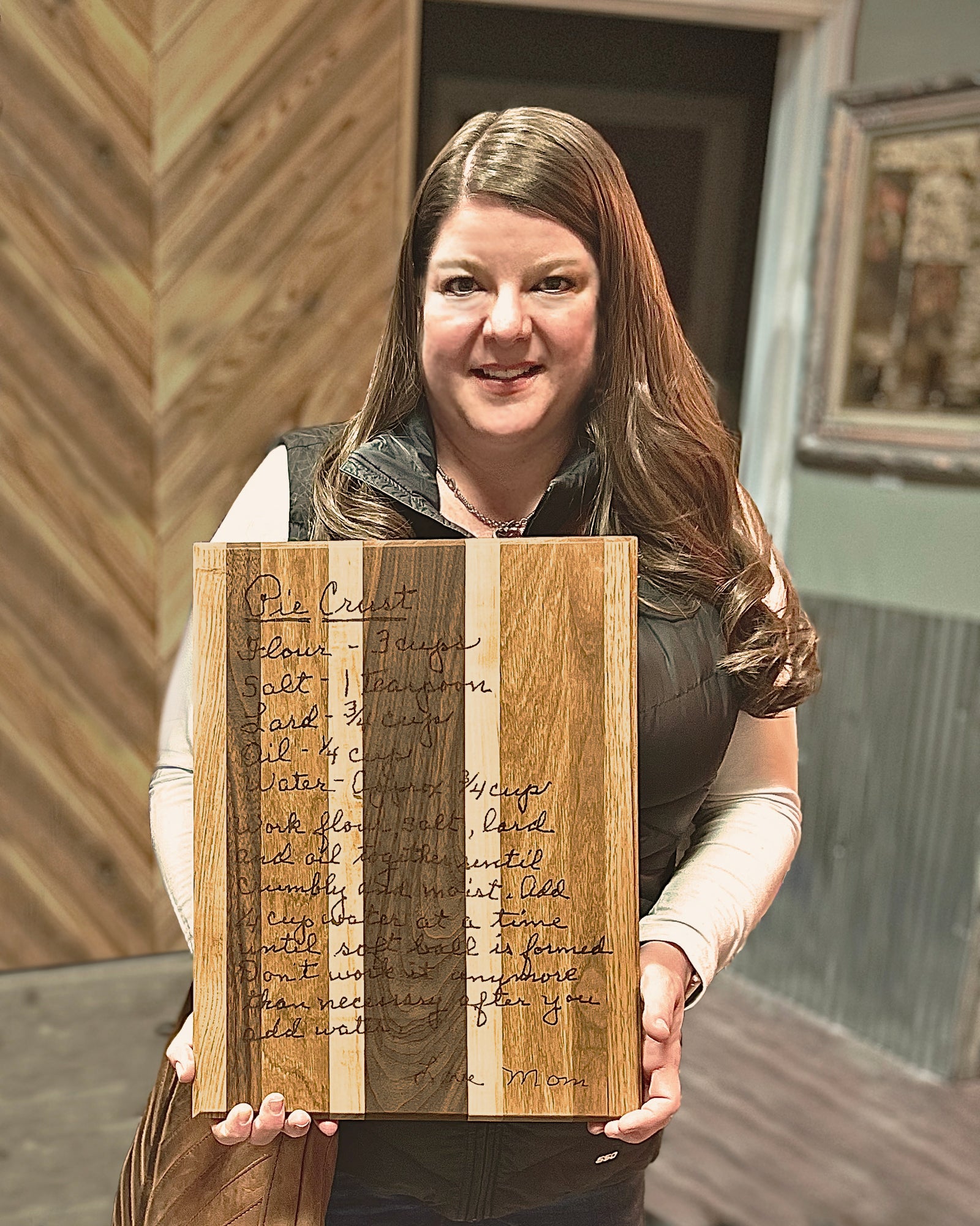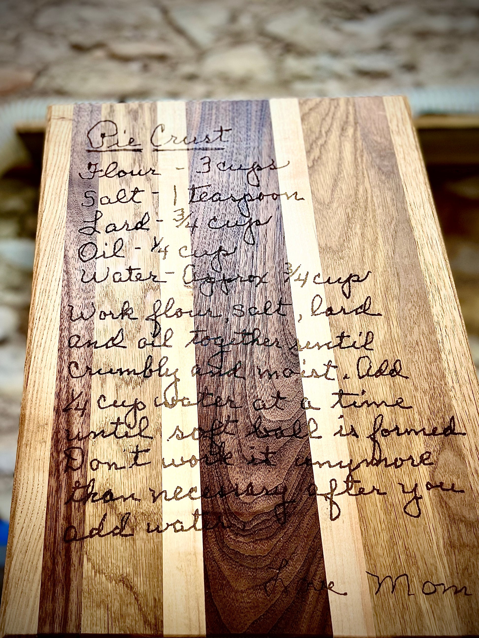 Turn a cherished family recipe into a personalized keepsake with this Custom Laser Engraved Cutting Board! Just upload a photo of your recipe, and we'll engrave it onto a striped wood board in the original handwriting without a background. It makes the perfect sentimental gift for birthdays, Mother's Day, and weddings that your loved ones will treasure for years to come. Each board design is unique and handmade by gluing hardwood planks of varying widths, engraving, then sealing with mineral oil for a food-safe coating.