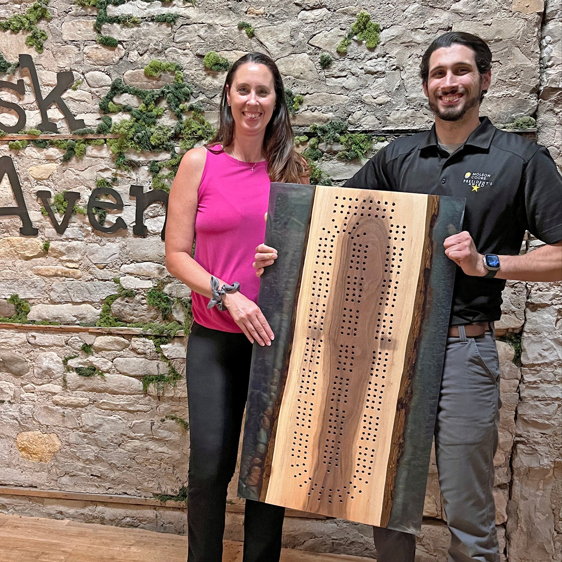 Craft a stunning centerpiece that’s both a coffee table and a game board—handmade by you in our DIY Studio! In this 2-day workshop, you’ll start by choosing your own live edge hardwood slab, drilling holes for the cribbage board, and selecting up to two mica powder colors to swirl into epoxy. Our instructors will guide you through each step of the process—from prepping the tabletop mold to mastering your final epoxy pour—so you can relax, learn, and enjoy the experience. At your first workshop, we'll get you scheduled for your second 3-hour session about 1 week later to allow for curing.