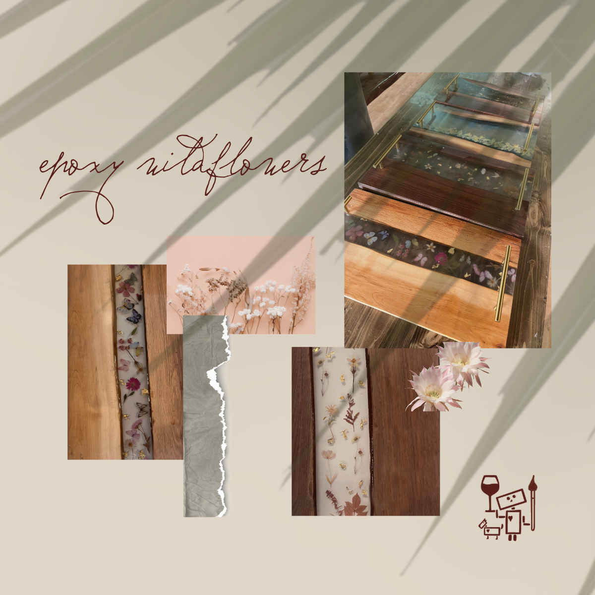 Join us in studio to create your own Epoxy Wildflower Tray! Get together with friends and make a stunning floral craft you'll love to use at home. It's perfect to display in your kitchen or arrange a charcuterie spread at your next gathering. We'll provide all the supplies you'll need including a wide variety of live-edge hardwood pieces, cut to size, as well as plenty of pressed flowers, leaves, and butterfly options to select from for the epoxy pour. You'll choose your boards, flowers, and up to 2 colors when you arrive. Feel free to mix-and-match your wood selection to fit your style. We'll guide you through each step from prepping the mold to the final pour. These projects take 48+ hours to cure then require final sanding by our workshop leaders. Please schedule a pick up time with our Project Pick Up Calendar for about 2 weeks after your workshop. When you pick-up, we'll will oil the board to reveal it's true colors, and you can decide to add handles from our stock or leave your board as is.